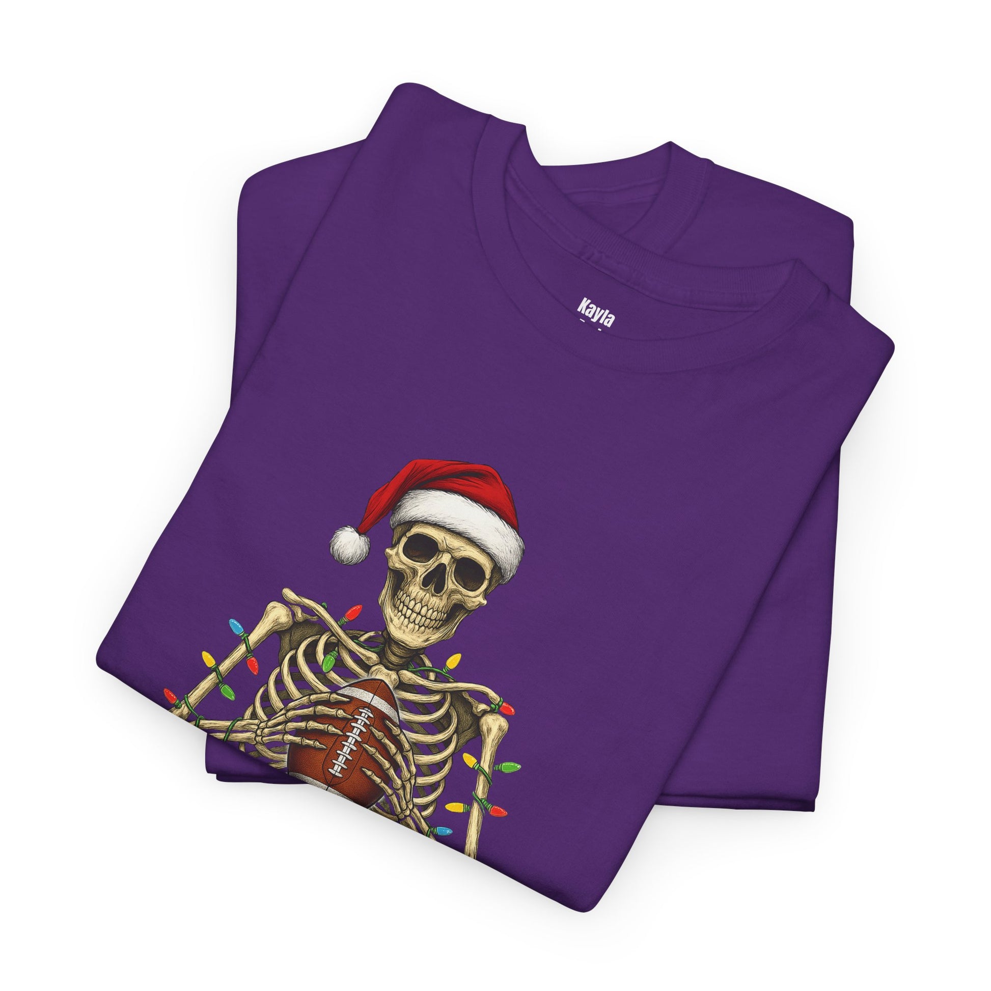 Show your unwavering love for football AND the holiday spirit with this hilarious and unique graphic t-shirt! This one-of-a-kind design by Kayla and Samantha features a cheerful skeleton fan, decked out in a Santa hat and wrapped in colorful Christmas lights, proudly clutching a football.
